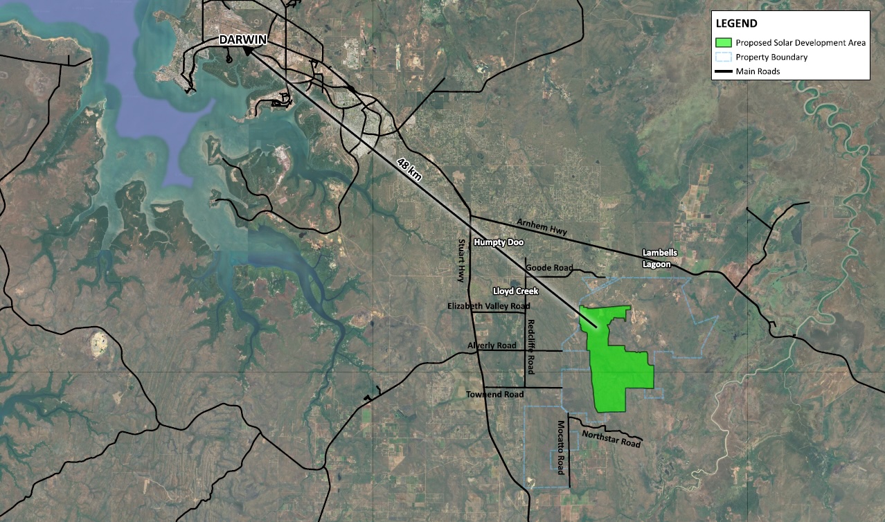 The Wak Wak solar project is proposed to be constructed on a pastoral station approximately 48 kilometres south-east of Darwin and 8 kilometres south-east of Humpty Doo. The project is proposed to consist of approximately 2.7 gigawatt-peak (GWp) of solar generation, and approximately 6 gigawatt-hour (GWh) of battery energy storage system (BESS).